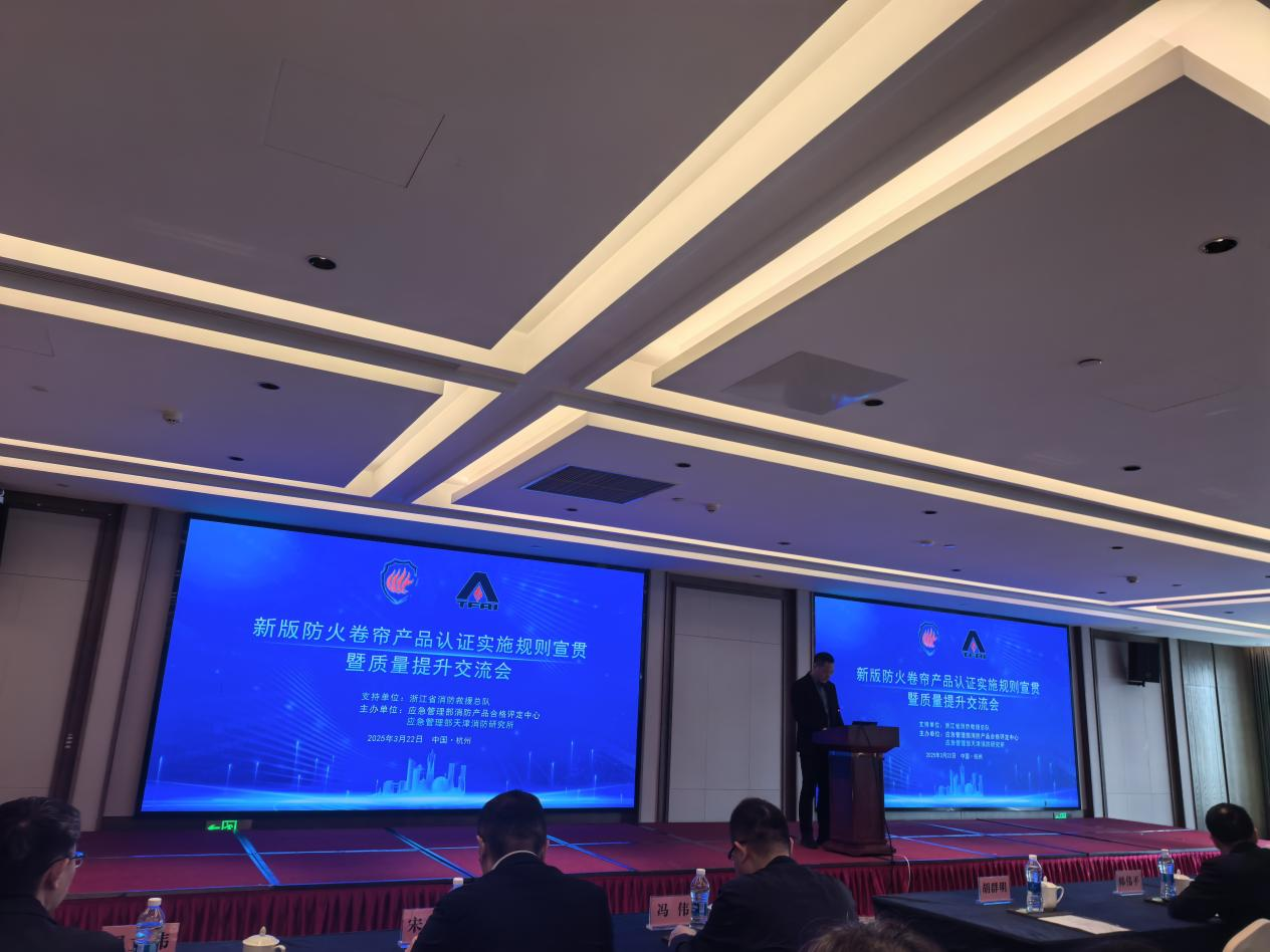次日召开的新版防火卷帘认证规则宣贯会,,,,由国家消防救援局科技司、、浙江省消防救援总队等单位联合主办,,,防火卷帘主流生产企业代表悉数到场。。。会上,,,,应急管理部消防产品合格评定中心专家系统解读新版认证实施规则及受理要求,,,,天津消防研究所技术团队详细对比GB  14102.1-2024《防火卷帘 第1部分:通用技术条件》、、、GB 14102.2-2024《防火卷帘 第2部分:防火卷帘用卷门机》与旧版标准的技术差异,,,,重点强调新型送检规范及质量控制要点。。。。