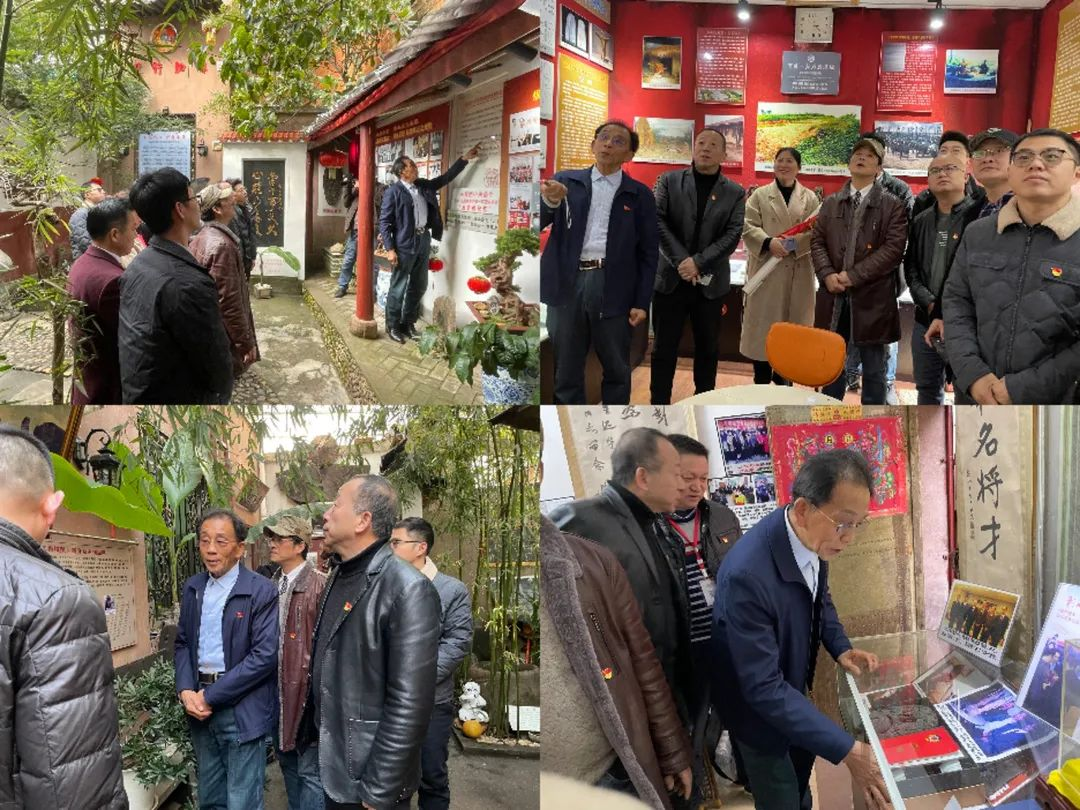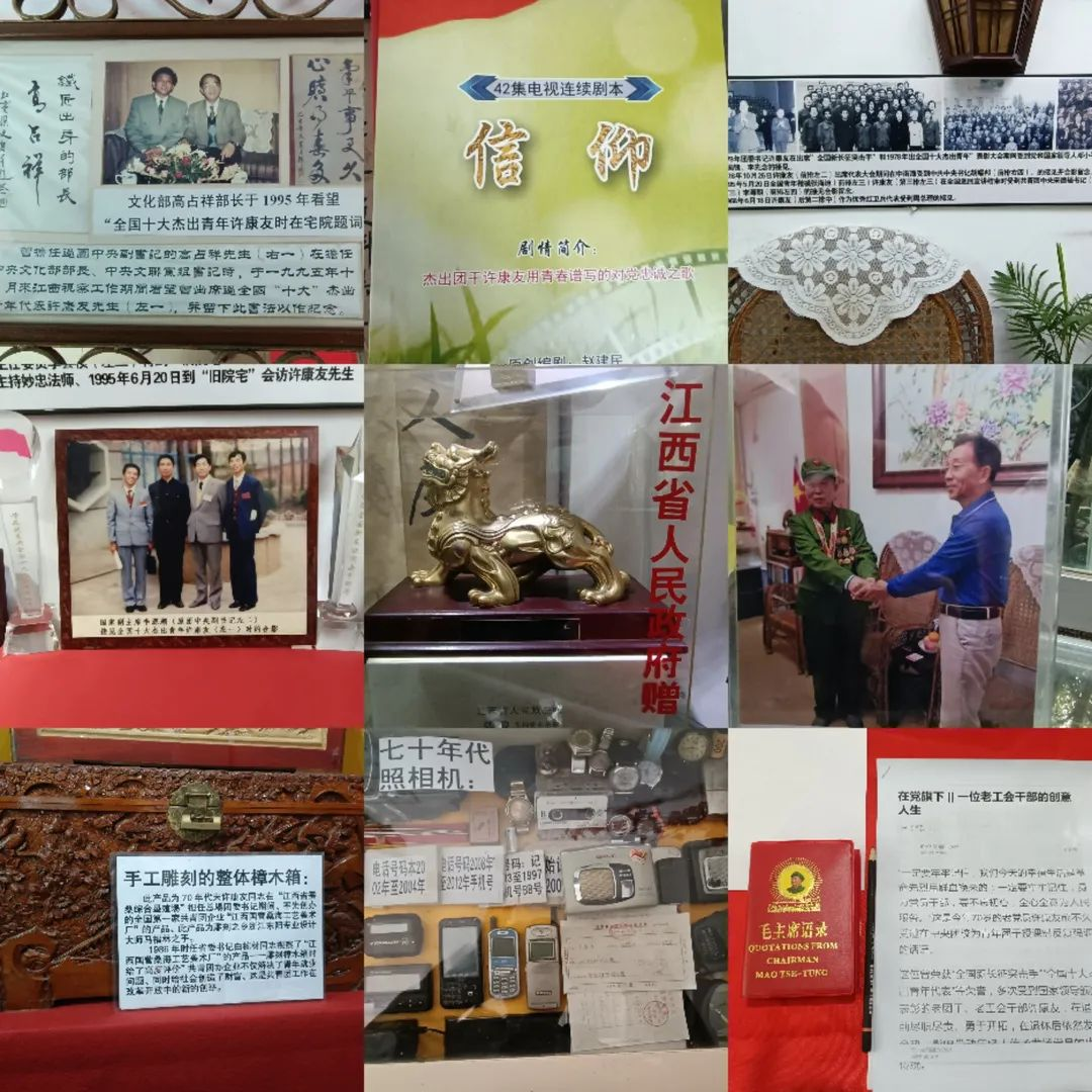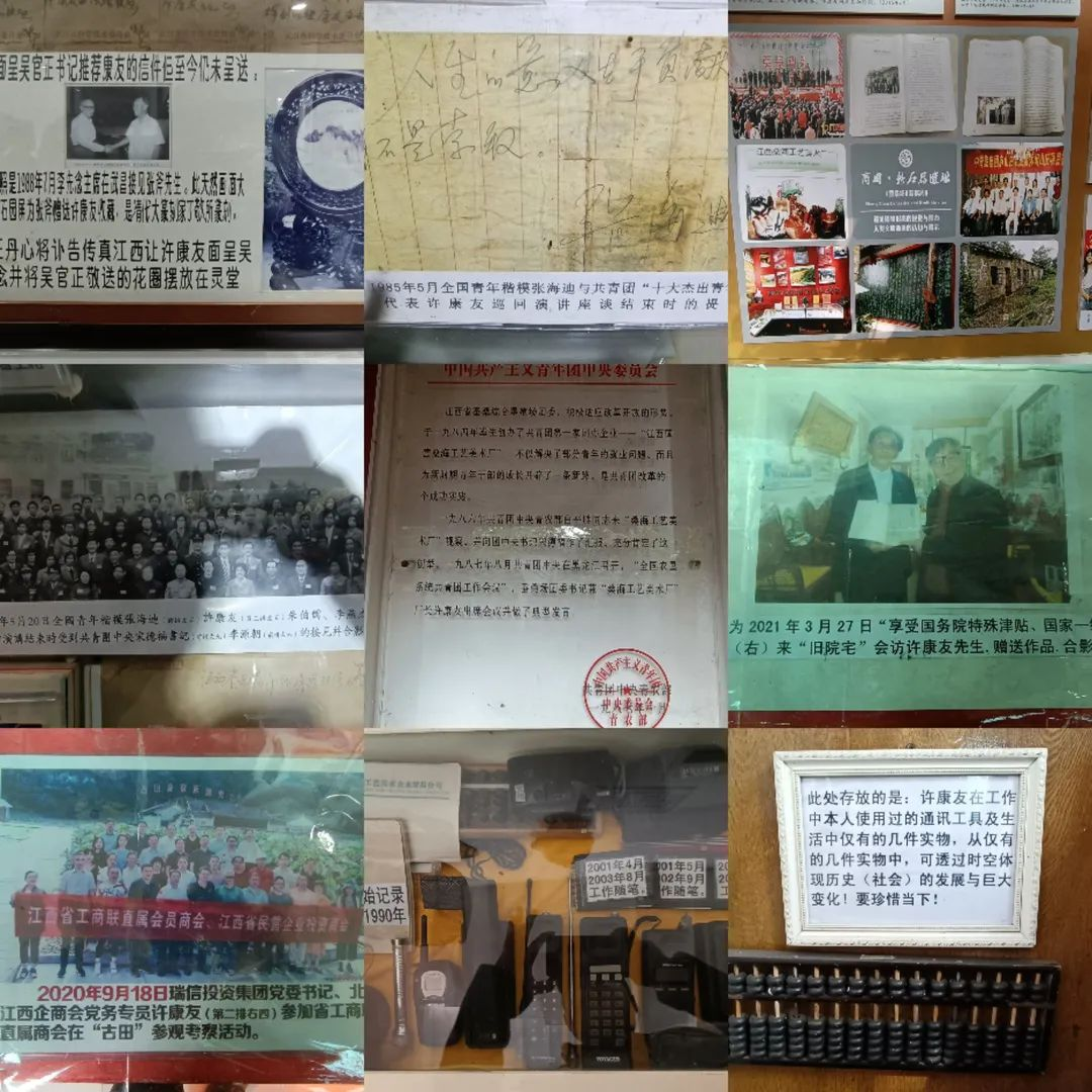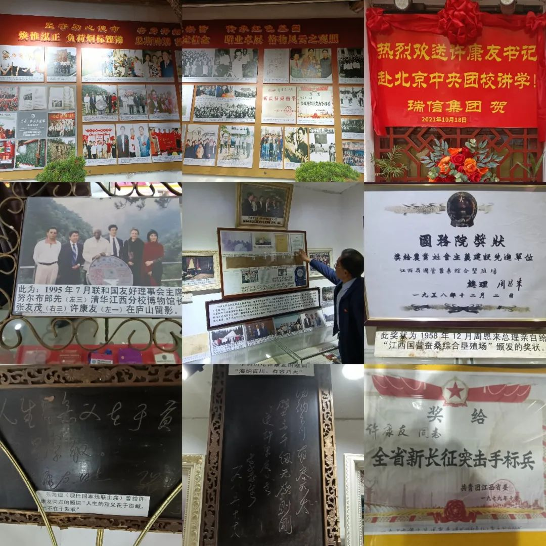 在许书记热情的接待下,,,,全体同事进入一扇古色古香的大门,,,,映入眼帘的是两幅挂满照片的展示墙,,,墙上满满的挂着这位70岁老党员一生尽职尽责、、、勇于开拓的奋斗历程。。在一个个放满纪念物品的陈列室中,,,在一张张充满故事的历史照片上、、、、在一封封充满历史沧桑的电文里、、、、在一件件历经斑驳岁月的实物前驻足参观,,,许书记饱含深情地讲述着他凭借对党事业的忠诚和热情所奋斗的经历——“江西蚕桑综合垦殖场团委书记、、、、共青团第一家团办企业江西国营桑海工艺美术厂创始人、、、国务院授予建设社会主义先进单位称号、、、全国新长征突击手、、全省新长征突击手标兵......”从许书记满是自豪和激动的语气中,,在场的党支部书记、、、、党员、、、入党积极份子们无比动容。。
